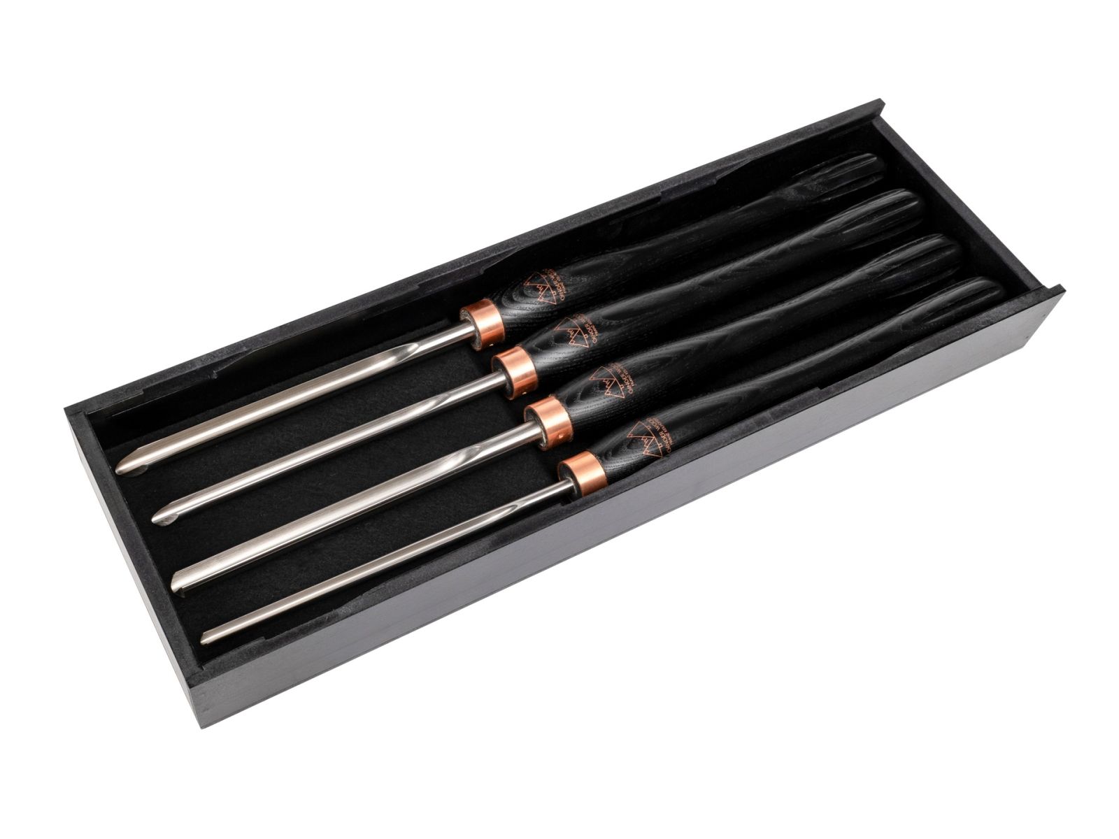 4 Schüsseldrehröhren unterschiedlicher Stärke, mit speziellen Anschliffen perfekt abgestimmt für jede Situation beim Schalendrechseln: