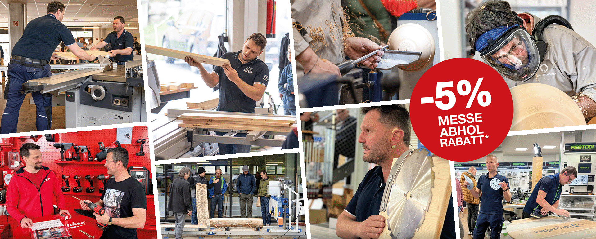 Verpassen Sie nicht diese Gelegenheit: *An der Kasse erhalten Sie zusätzlich 5 % Abholrabatt auf unsere Aktionspreise! Nur bei Abholung auf den Hausmessen! Gültig auf alle lagernden Maschinen, Zubehör und Werkzeuge. Auch auf bereits reduzierte Ware! (Ausgenommen MAFELL Produkte)