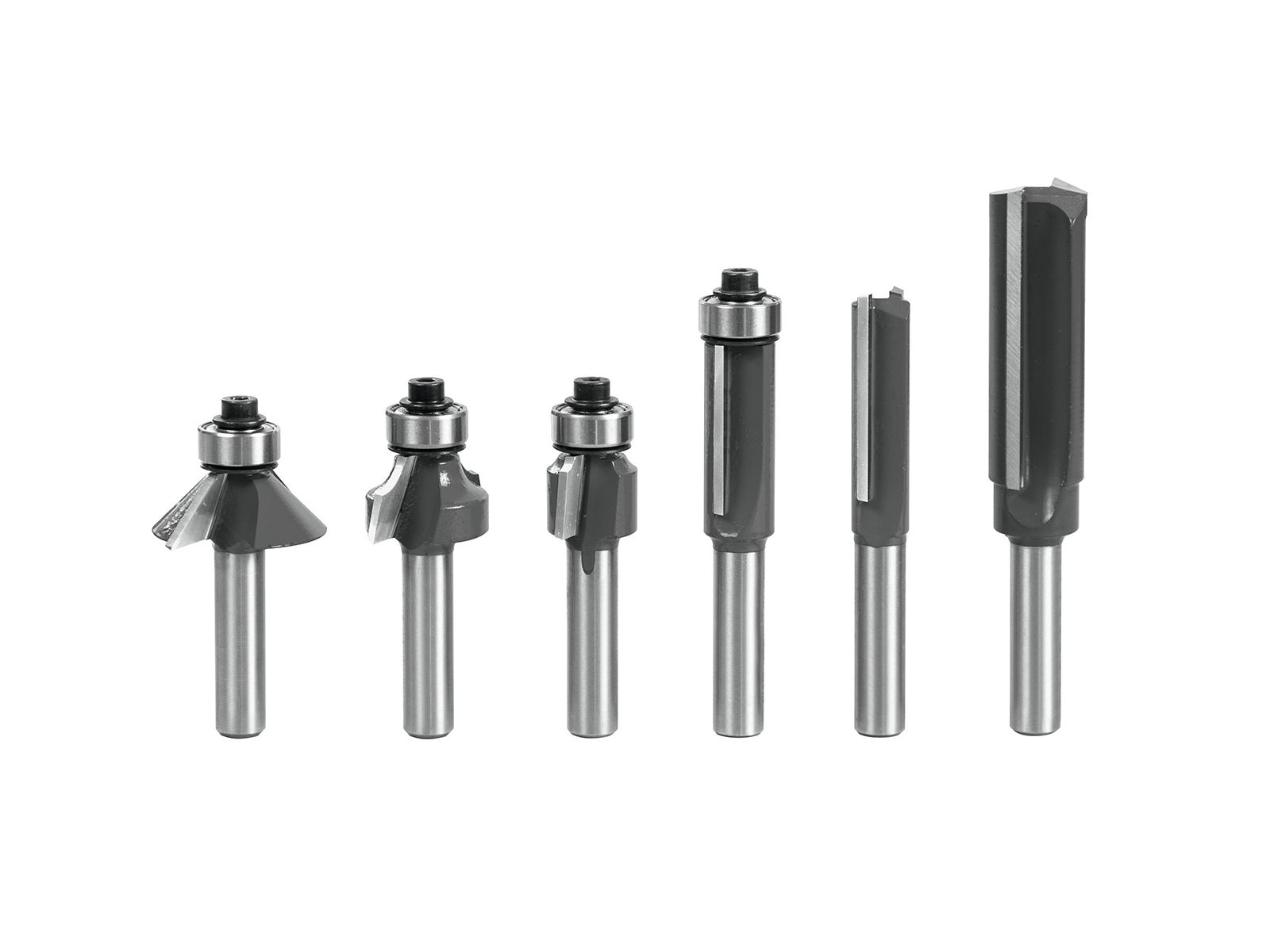 Hochwertiges, 6-teiliges Fräserset bestehend aus den wichtigsten Oberfräsern mit 8 mm Schaft für ihre Oberfräse.