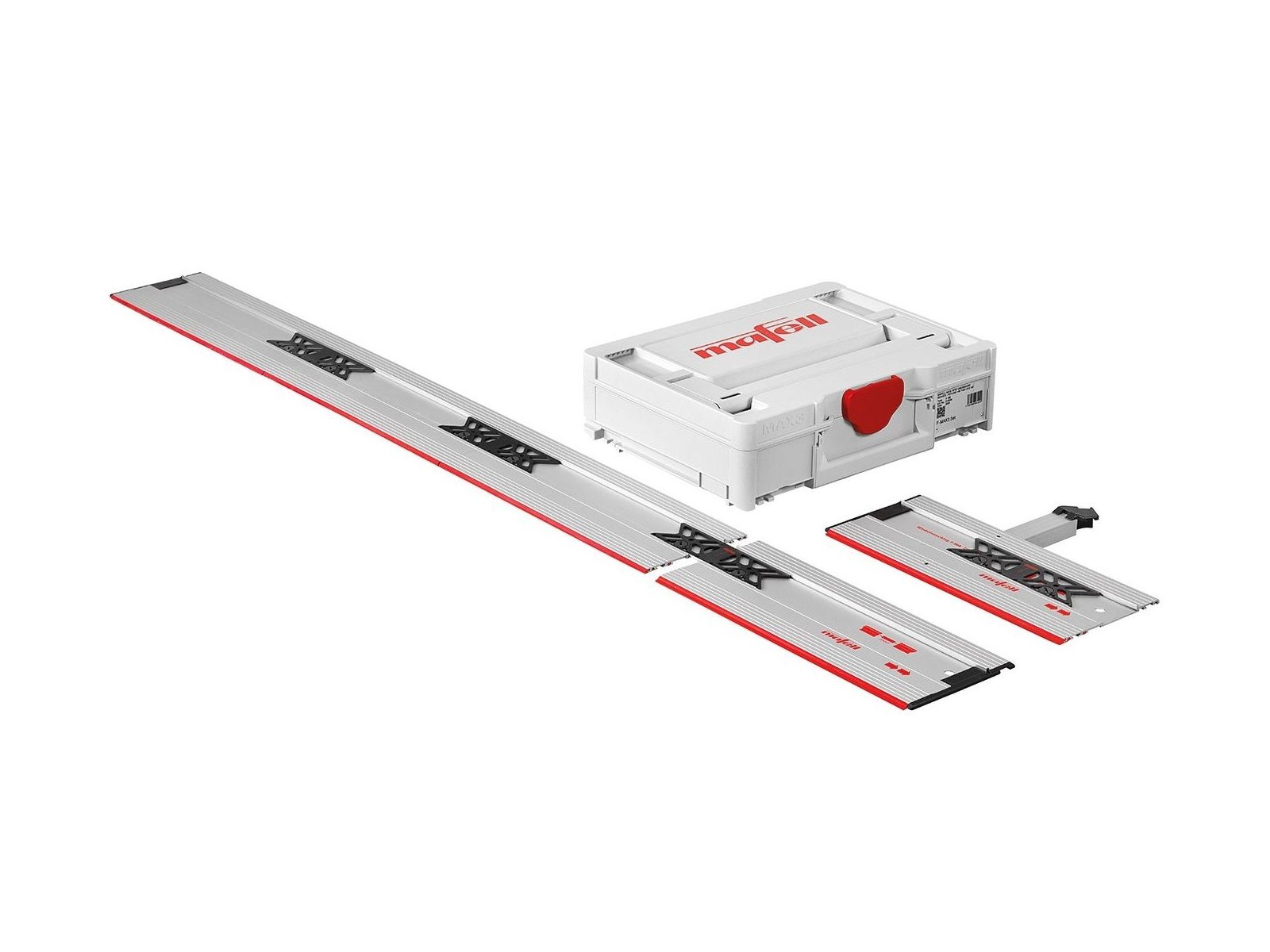 Mit dem Führungsschienen-Set F-MS im MAX3 sind Führungsschienen-Elemente und ein praktischer 90° Winkelanschlag einfach und kompakt im MAX3 zu transportieren. Die Gummilippe ist Anlegekante und Ausreißschutz in einem, für optimale Arbeitsergebnisse wird sie vor dem ersten Schnitt auf Ihre Säge eingeschnitten. Der eloxierte Gleitbelag auf der Schienenoberseite fördert eine angenehme Handhabung und verringert den Schubwiderstand der Handkreissäge. Der im Lieferumfang enthaltene Profilabschluß verhindert am Schienenanfang das Verhaken von Kabel und Absaugschlauch. Die Breite der Schiene wurde so gewählt, dass die komplette Maschinen-Grundplatte beim Schnitt darauf gleitet.