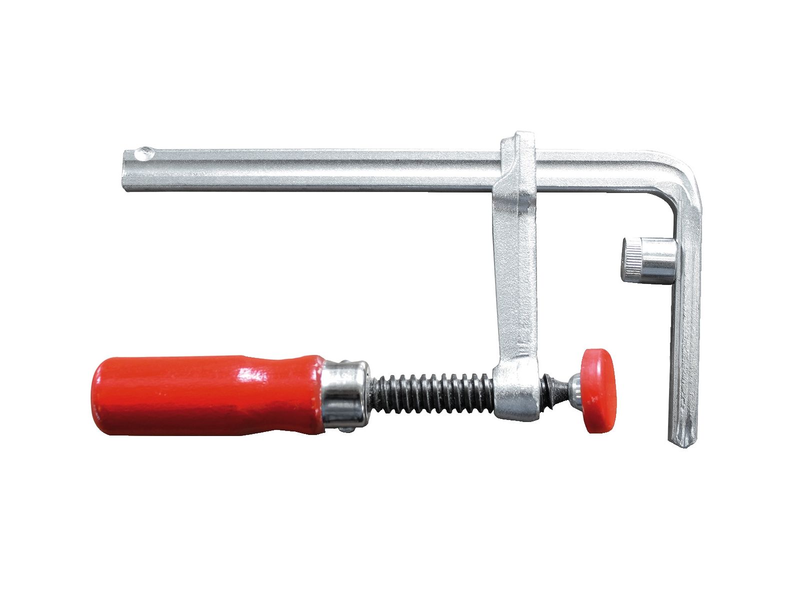 Schraubzwinge mit Anschlag zur positionsgenauen Fixierung der Dübellehre mit Verlängerung am Werkstück.