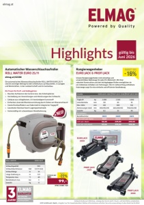 Gültig bis Ende Juni 2026 bzw. solange der Vorrat reicht, Druck- und Satzfehler vorbehalten. UVP in EUR exkl. MwSt., Angebot nur für Gewerbekunden! Nähere Informationen erhalten Sie unter www.elmag.at oder direkt bei ELMAG! gültig bis Juni 2026 Highlights elmag.at 3BEI ONLINEREGISTRIERUNG JAHRE GARANTIE www.elmag.at/3jahre Automatischer Wasserschlauchaufroller ROLL WATER EURO 25/11 elmag.at/42268 Die automatischen Wasserschlauchaufroller ROLL WATER EURO 25/11 sind ein wichtiger Beitrag für den Unfallschutz auf Baustellen, in Garagen und Werkstätten, in der Landwirtschaft und im Gartenbau. Ein Traum für Profi- und Hobbygärten: > Rasches Aufräumen des Gartens bzw. des Arbeitsplatzes > Vermeidung von Verwicklungen und Abnützungen des Schlauchs > Gehäuse aus schlagfestem, UV-beständigem Kunststoff > Einfaches Lösen der Blockiervorrichtung durch Ziehen am Wasserschlauch > Starke Rücklauffedern aus Federstahl & integrierter Tragegriff > Geordneter Rücklauf durch Lagenspulmechanik > Serienmäßig mit schwenkbarer Wandhalterung ROLL WATER EURO 25/11 Technische Daten Schlauchqualität PVC Schlauchdurchmesser Zoll 1/2 (11 mm) Schlauchlänge m 25 Länge Zuleitung ca. m 0,9 Temperatur max. °C 40 Betriebsdruck max. bar 5 Gewicht kg 11 127,- 99,- -22% rabatt stattpreis exkl. mwst. UVP INkl. 20% mwst. 118,80 NEU! Modelle EURO JACK 2000 PROFI JACK 2500 PROFI JACK 3000 Technische Daten Tragkraft kg 2.000 2.500 3.000 Unterfahrhöhe mm 130 80 95 Max. Höhe mm 330 500 552 Abmessungen lxbxh mm 440x195x140 682x340x150 790x355x180 Gewicht kg 8,3 32 44 Bestelldaten Bestellnummer 33610 33600 33615 Statt-UVP exkl. MwSt. 69,00 255,00 265,00 UVP exkl. MwSt. 58,00 229,00 249,00 UVP inkl. 20% MwSt. 69,60 274,80 298,80 Rangierwagenheber EURO JACK & PROFI JACK Unsere Rangierwagenheber sind vielseitige und unverzichtbare Werkzeuge für jede Kfz-Werkstatt. Mit ihrer robusten Konstruktion und den leichtgängigen Rollen ermöglichen sie ein müheloses Anheben von Fahrzeugen. Die im Lieferumfang enthaltene Hubstange sorgt für eine einfache und effiziente Handhabung. -16% rabatt bis EURO JACK 2000 PROFI JACK 3000 PROFI JACK 2500