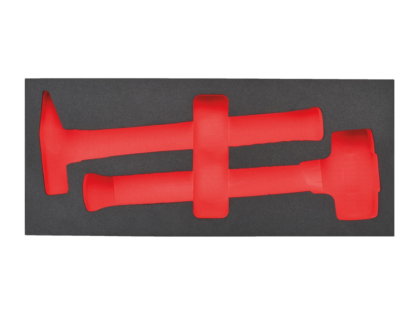 Strapazierfähige Schaumstoffeinlage für die geordnete Aufbewahrung eines Fiberglas-Schlosserhammers und Schonhammers.