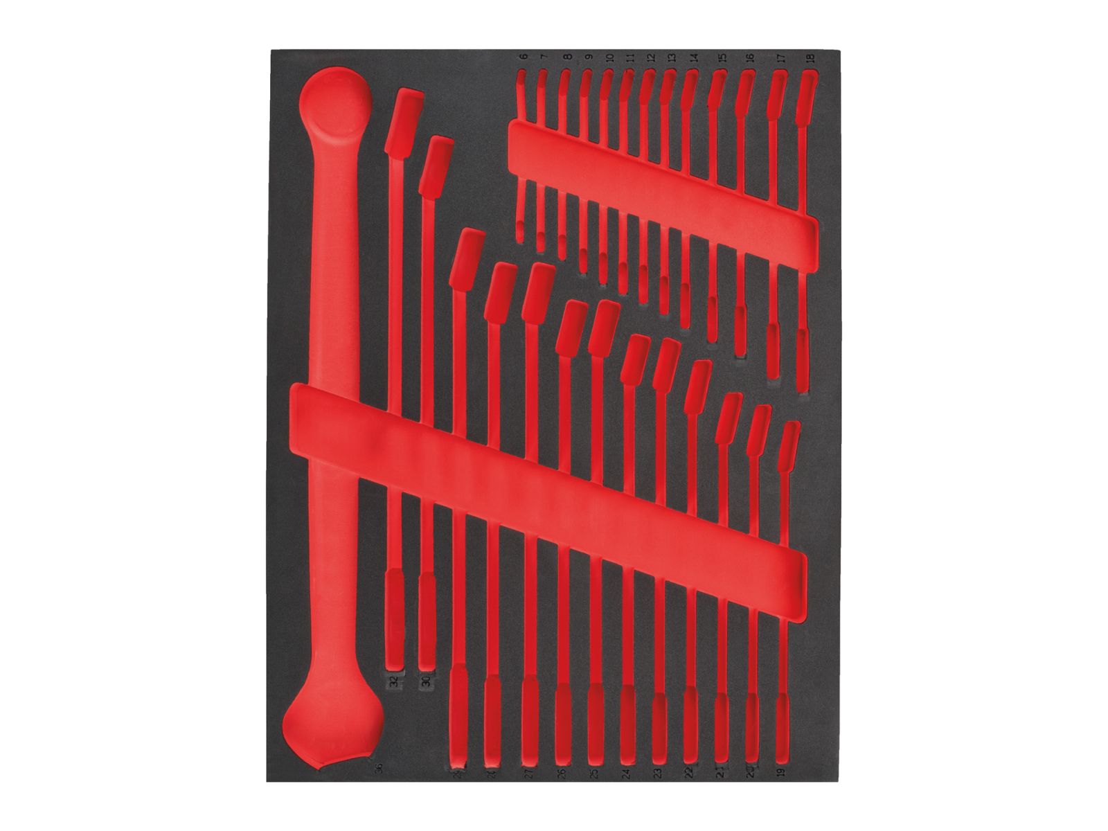 Strapazierfähige Schaumstoffeinlage für die geordnete Aufbewahrung von MAX BITE Ringmaulschlüssel, 27-teilig.