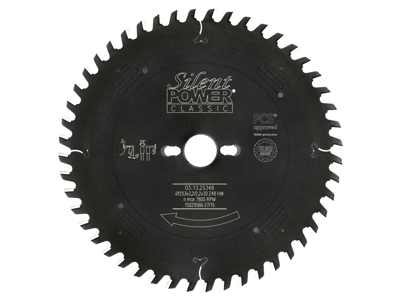 SILENT POWER Kreissägeblätter werden nach modernsten Standards produziert und entsprechen höchsten Anforderungen bei Standzeit und Präzision. Die Kreissägeblätter sind mit Nebenlochbohrungen ausgestattet, die für praktisch jeden Kreissägentyp passen. Durch die Drehschlitze wird ein ruhiger und vibrationsfreier Lauf erreicht. Alle Sägeblätter sind mit HM-Schneiden (interntionale Bezeichnung: HW) ausgerüstet.